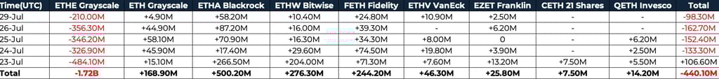 However, the standout exception was Grayscale’s converted fund, ETHE, which experienced significant net outflows (reason below). Over $1.7 billion exited the fund last week, leading to a total net outflow of $440.1 million across all U.S. spot Ethereum ETFs.