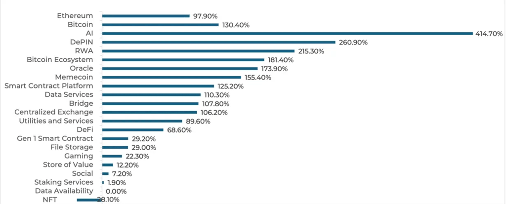 Over the past year, the cryptocurrency market has seen diverse sector performance. The AI sector leads with an impressive 414.7% increase, highlighting the growing importance of AI-related cryptocurrencies. Following this, RWA (Real World Assets) and DePIN (Decentralized Physical Infrastructure Networks) have surged by 215.3% and 260.9%, respectively, showing strong interest in bridging digital and physical assets and decentralized infrastructure. Centralized exchanges and DeFi rose by 106.2% and 68.6%, respectively, indicating increased trading activity and interest in decentralized finance.