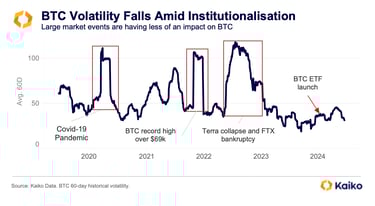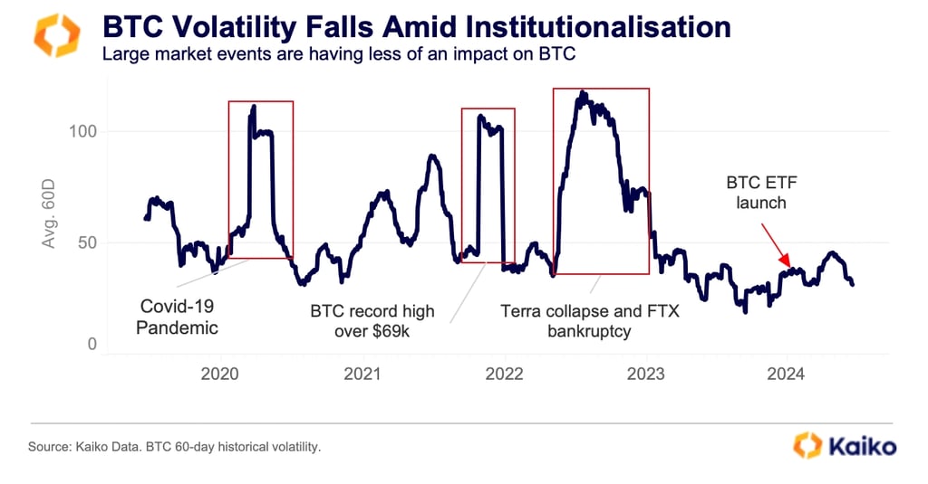 In 2024, Bitcoin reached an all-time high with a volatility rate of 40%. This is significantly lower compared to 2021, when volatility soared to over 106% during its record-breaking highs.