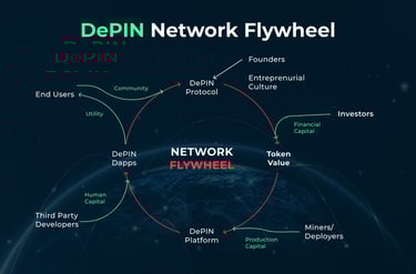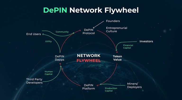 The DePIN flywheel concept revolves around incentivizing providers to commit their resources to the network, which attracts more users due to cheaper service charges. This increased participation boosts the value of the network’s native token, creating a cycle of growth and attracting more providers and investors.